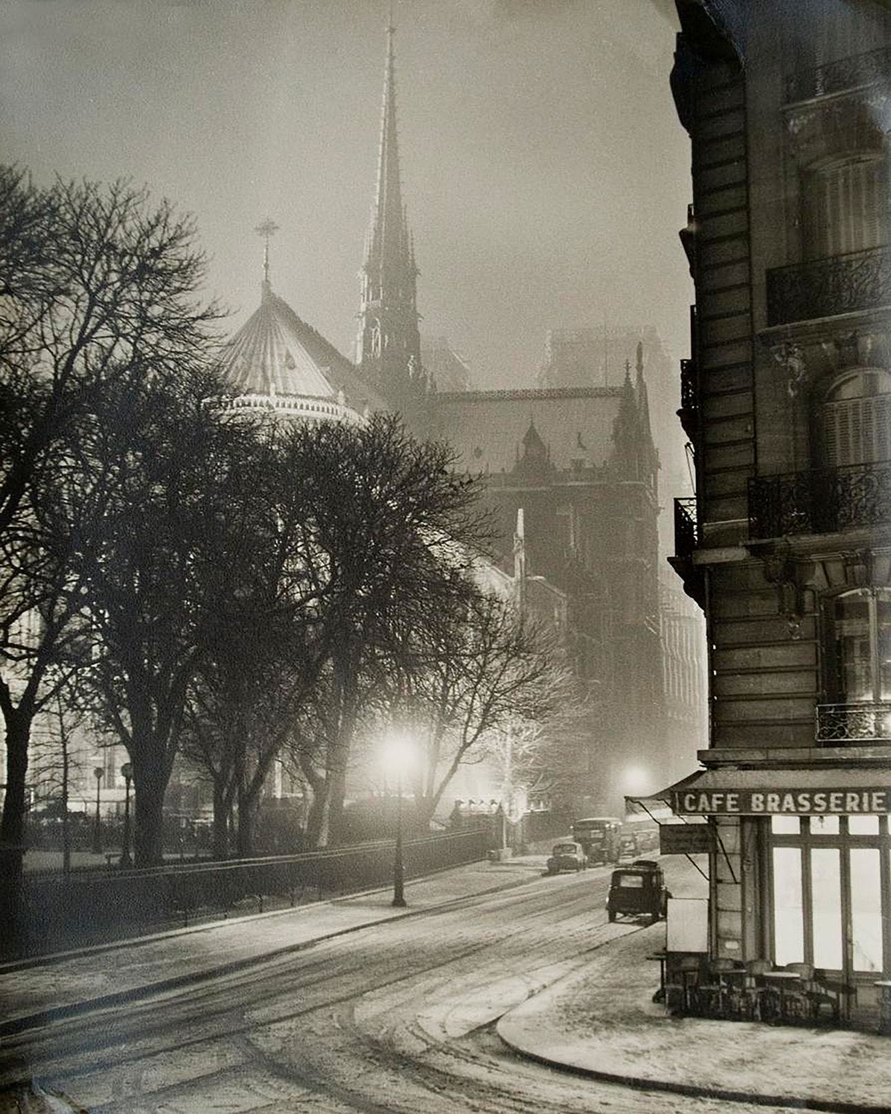 Albert Monier's "Notre Dame un Soir de Neige, Paris, 1953" offers a glimpse into 1950s Paris, a time when the city was rebuilding and thriving culturally.