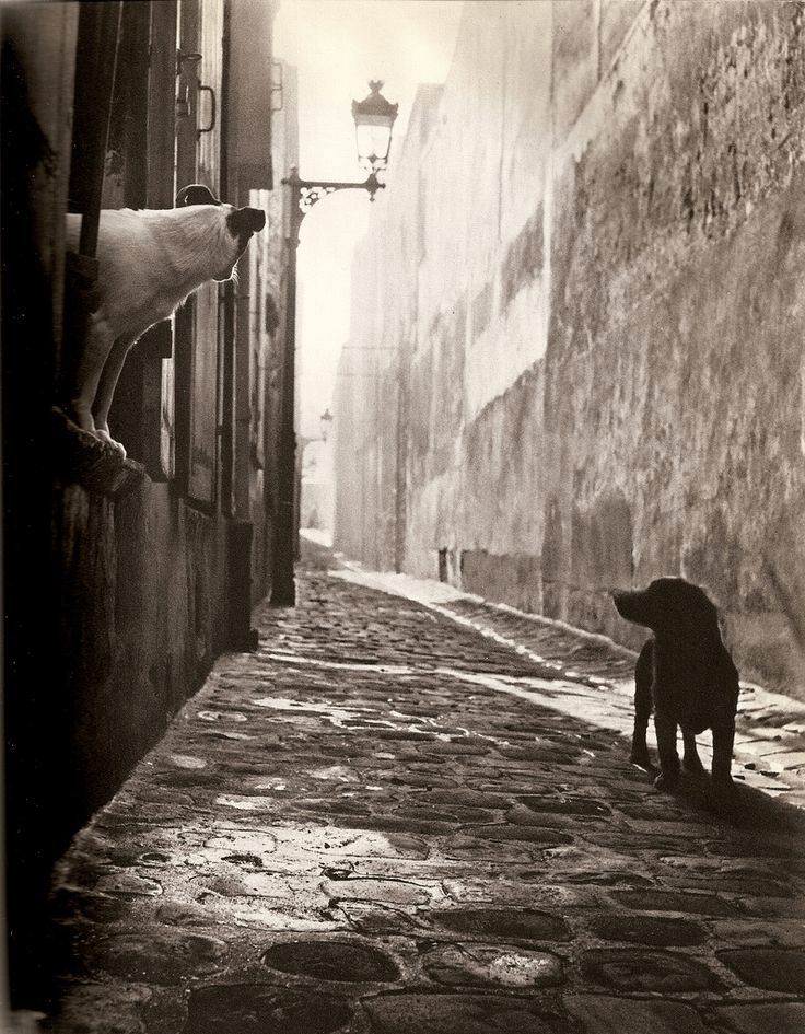 This particular image demonstrates his talent for capturing what Henri Cartier-Bresson called "the decisive moment"—that split second when all the elements of a photograph come together perfectly. The curious interaction between the two dogs, one peering down from above while the other stands in silhouette on the cobblestones below creates a whimsical narrative that typifies Izis's ability to find poetry in the streets of Paris.