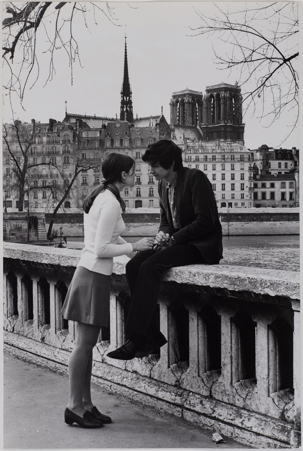 This 1969 photograph by J. Marquis, titled "Sur la balustrade du Pont Louis-Philippe," captures a tender moment on a bridge in Paris’s 4th arrondissement.