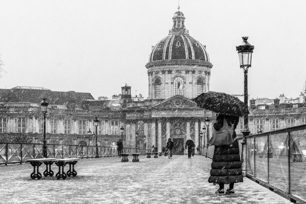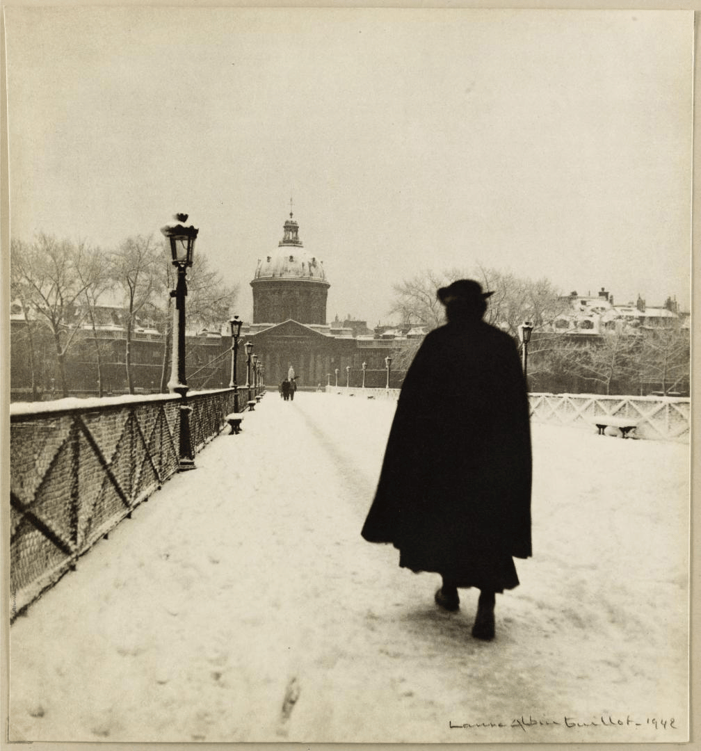 I admire the way Laure Albin-Guillot’s photography brings out the quiet moments and the unique character of Paris. This image, with its soft snowfall and solitary walker, evokes a sense of calm and reflection for me.