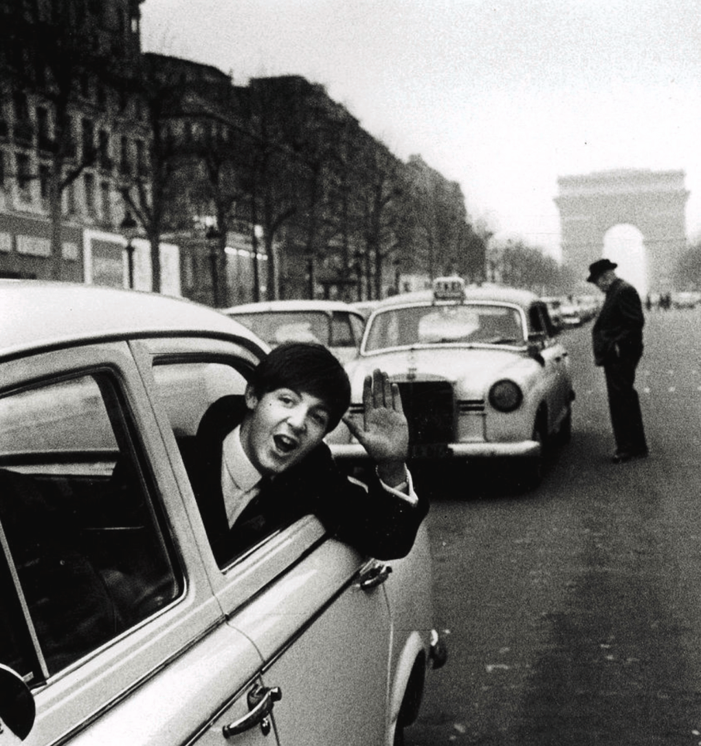 This iconic photograph captures Paul McCartney of The Beatles waving from a taxi on the Champs-Élysées in January 1964. Taken by the Popperfoto agency, the image is part of a renowned collection that documents significant cultural moments.