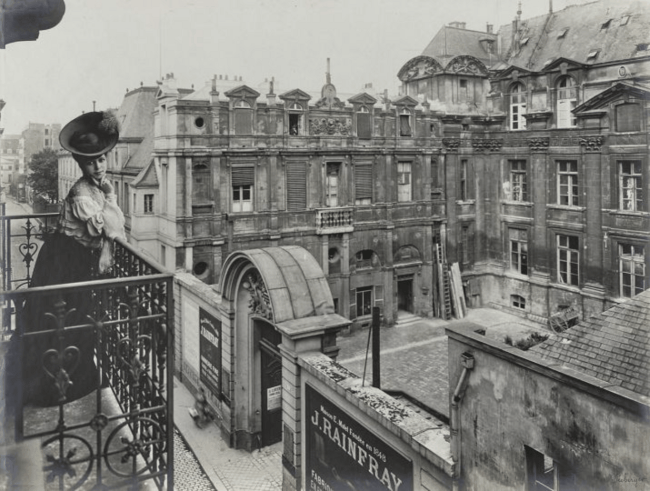 This photograph by the Séeberger brothers captures the Hôtel Lamoignon, one of the finest Renaissance mansions in Paris's historic Marais district. A woman in Belle Époque attire stands at a wrought-iron balcony, gazing at the elegant courtyard and façade of this 16th-century hôtel particulier. The image provides a glimpse of both architectural heritage and daily life in early 20th century Paris.