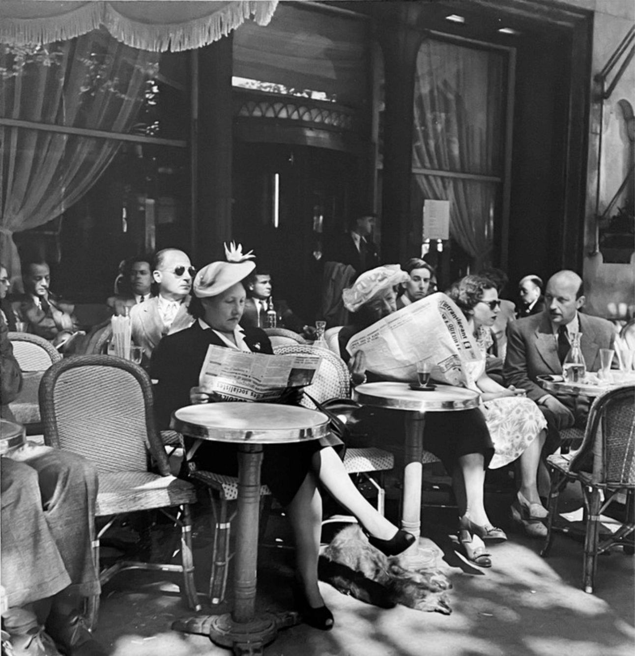 Carone, who worked extensively for Paris Match magazine, was known for his keen eye for documenting both everyday Parisian life and the celebrities of his era. This particular photograph demonstrates his talent for capturing authentic moments while maintaining a sense of compositional refinement. The elegant details - from the café's draped curtains to the fashionable hats and attire of the patrons - paint a vivid picture of a time when Paris was reclaiming its position as the world's capital of style and leisure. The relaxed postures of the newspaper readers and the sleeping dog beneath the table add a touch of natural charm to this carefully observed scene.